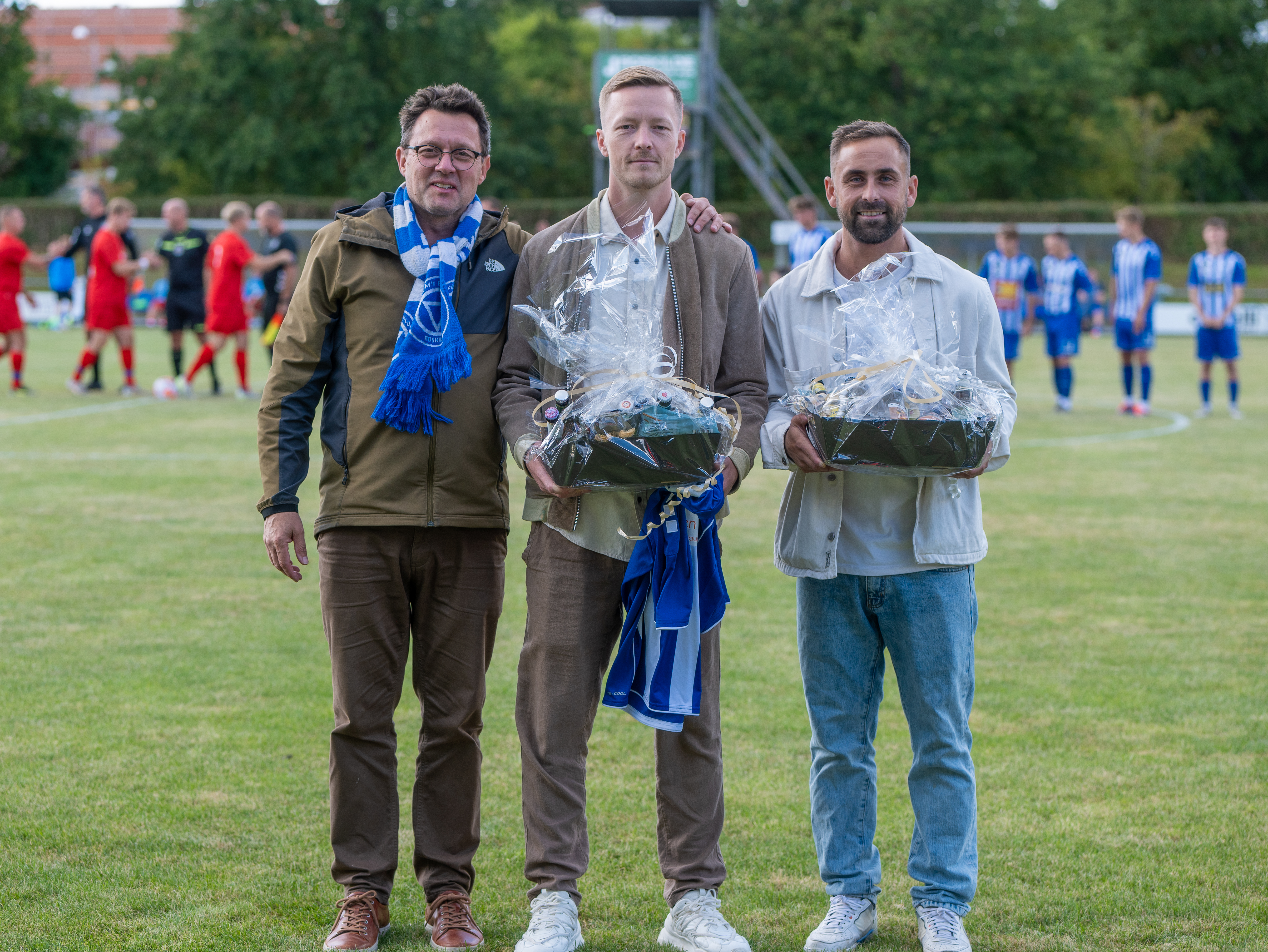 Mico Elvig (tv) og Emil Ølvang sammen med formand Per-Henrik Nielsen (Pelle). Ølvang er med 317 kampe den , der har spillet næstflest kampe på KFUM's førstehold. Kun overgået af Gerhard Klaschka, der nåede 423. FOTO: SULANJI NAUMANN