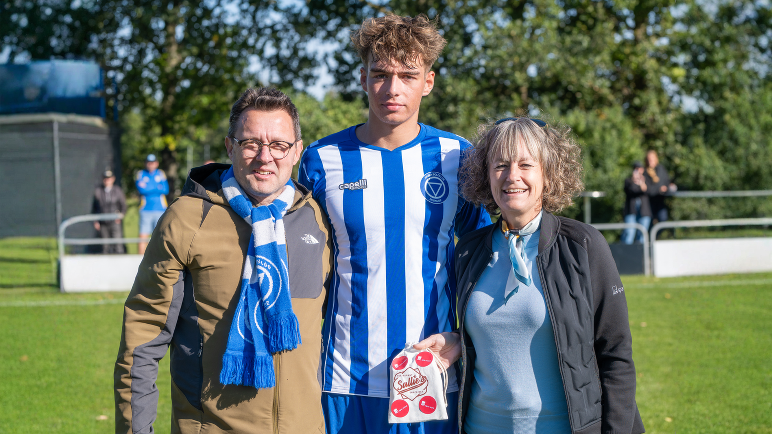 Scott Ross blev kåret til KFUM's bedste mod Hellebæk og modtog et gavekort fra Spar Nord Bank og Sallies. Her ses Scott sammen med KFUM's formand, Per-Henrik Nielsen (Pelle) og Tine Remien fra Spar Nord Bank. FOTO: SULANJI NAUMANN